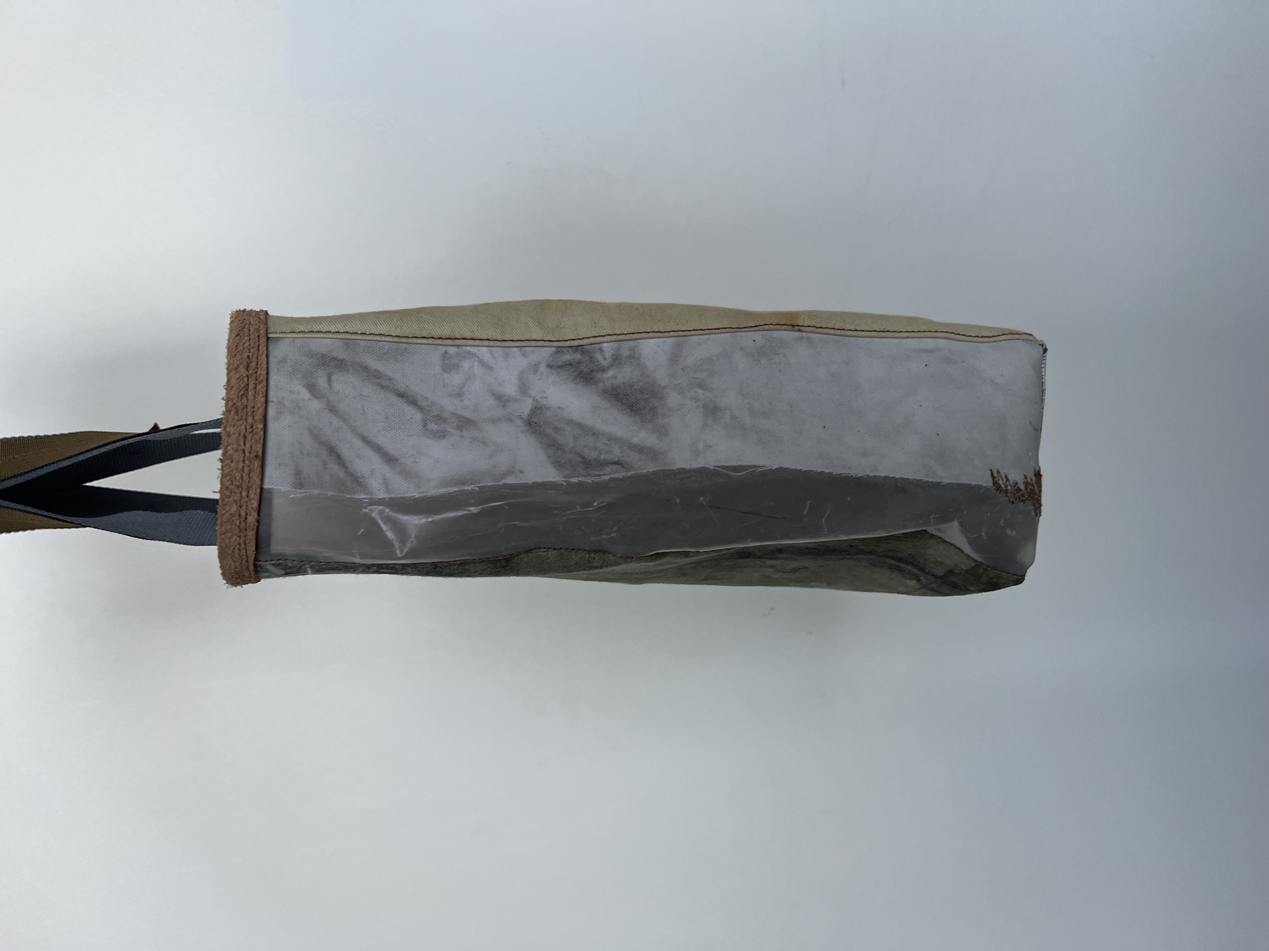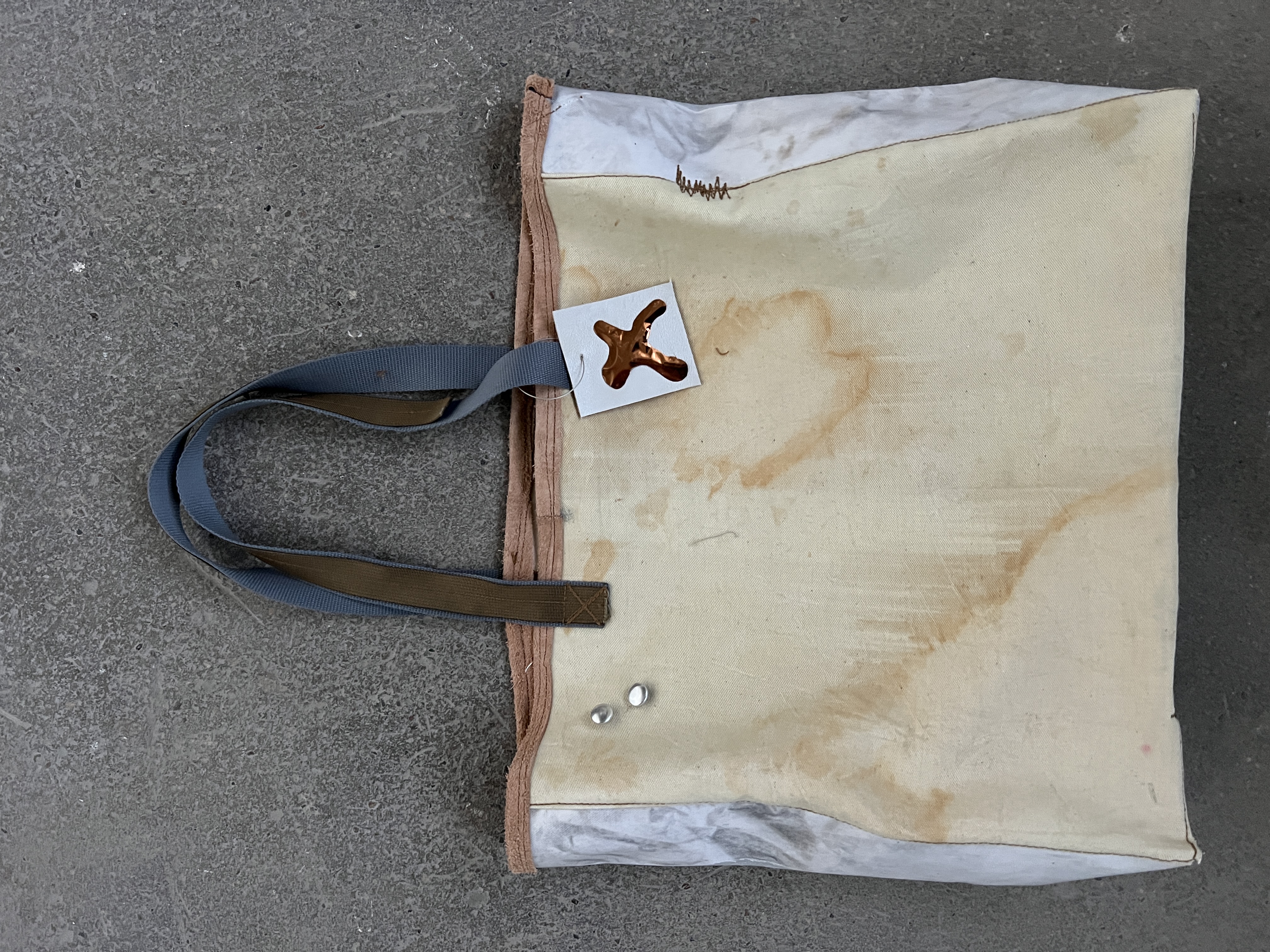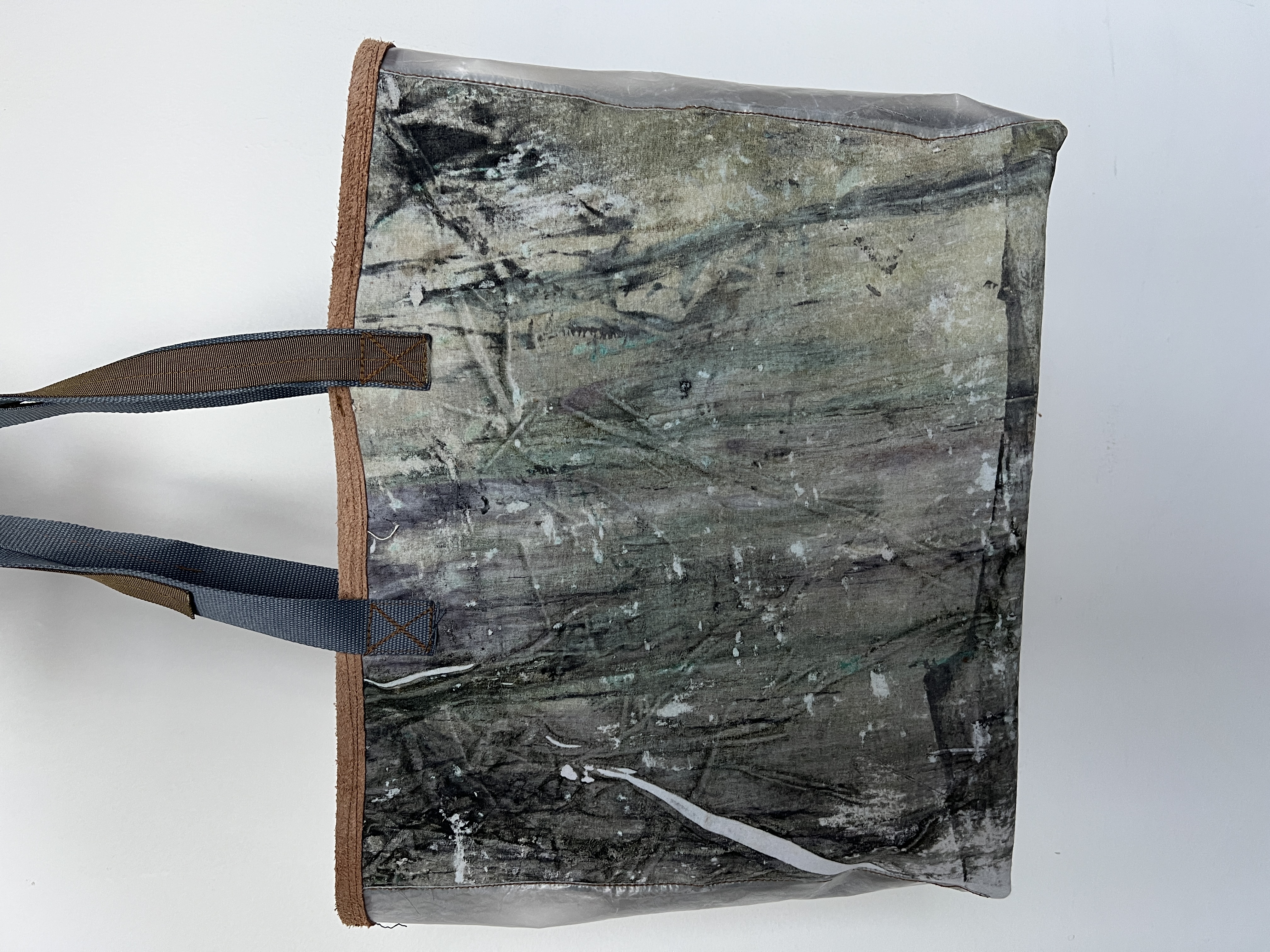 Five panel box bag constructed from archival metal printed cotton by Nick. Cotton fabric is allover printed with copper, iron, and aluminum and patinated to give metals variable hues. Backside made from grass dyed heavyweight canvas material.