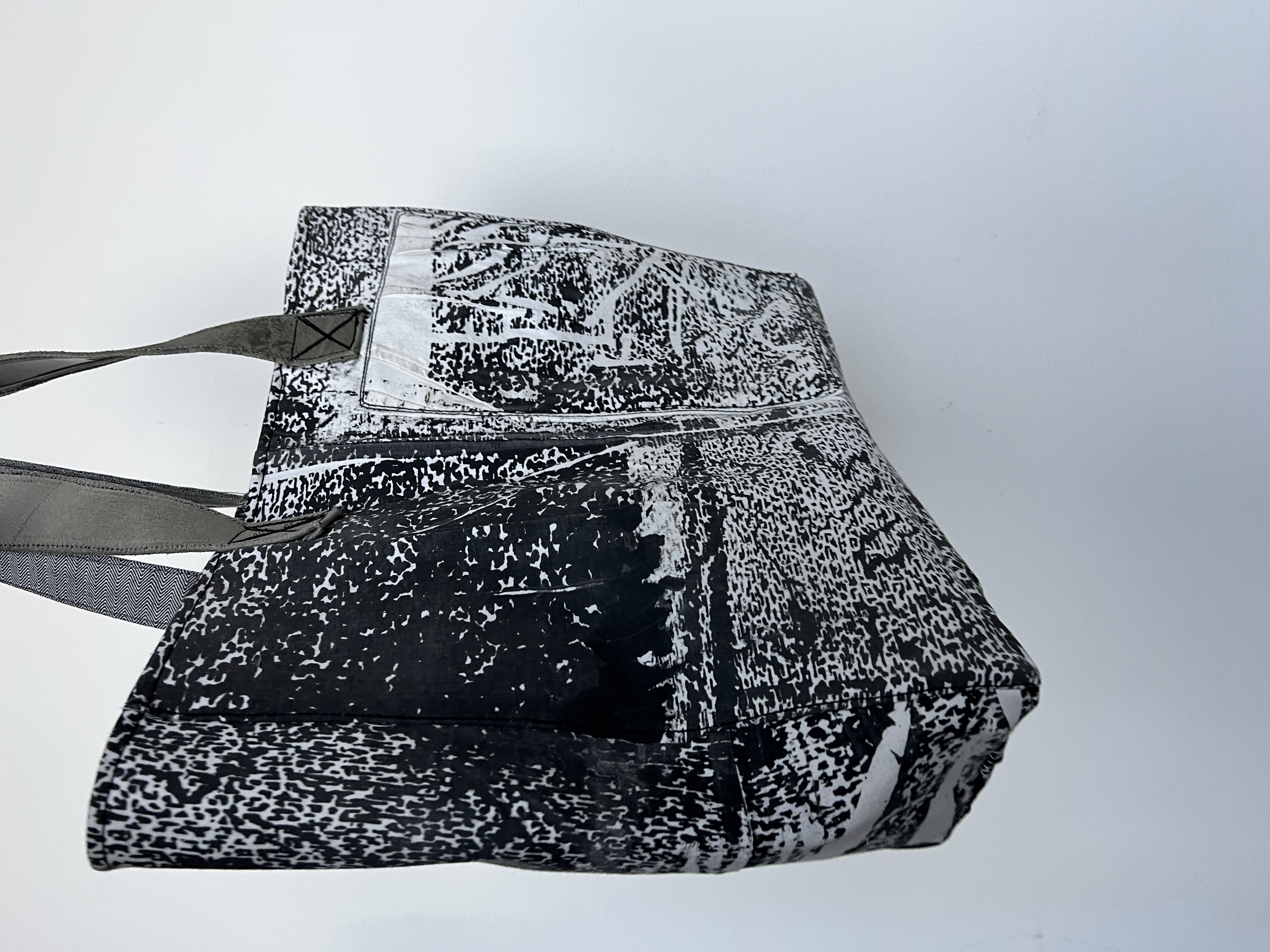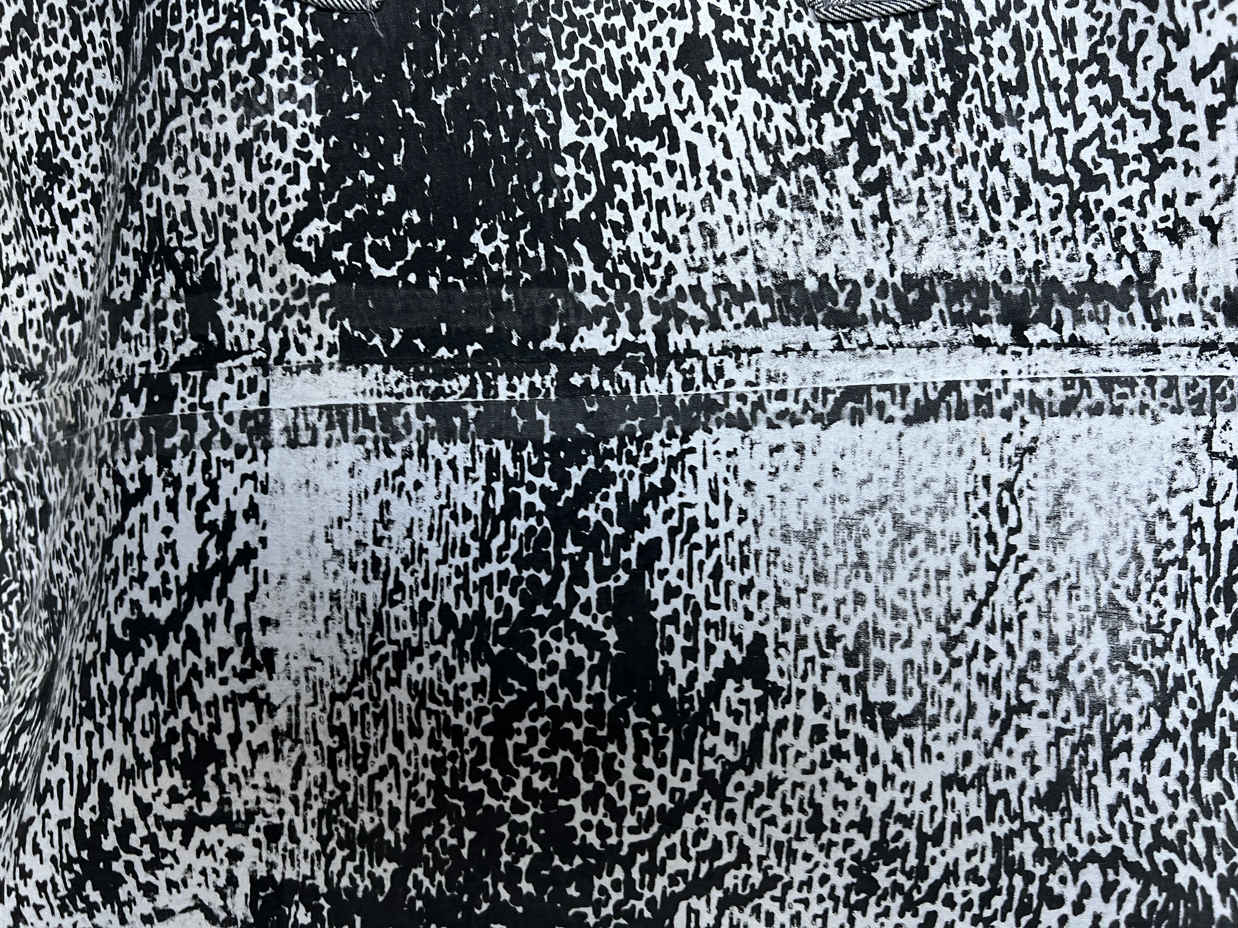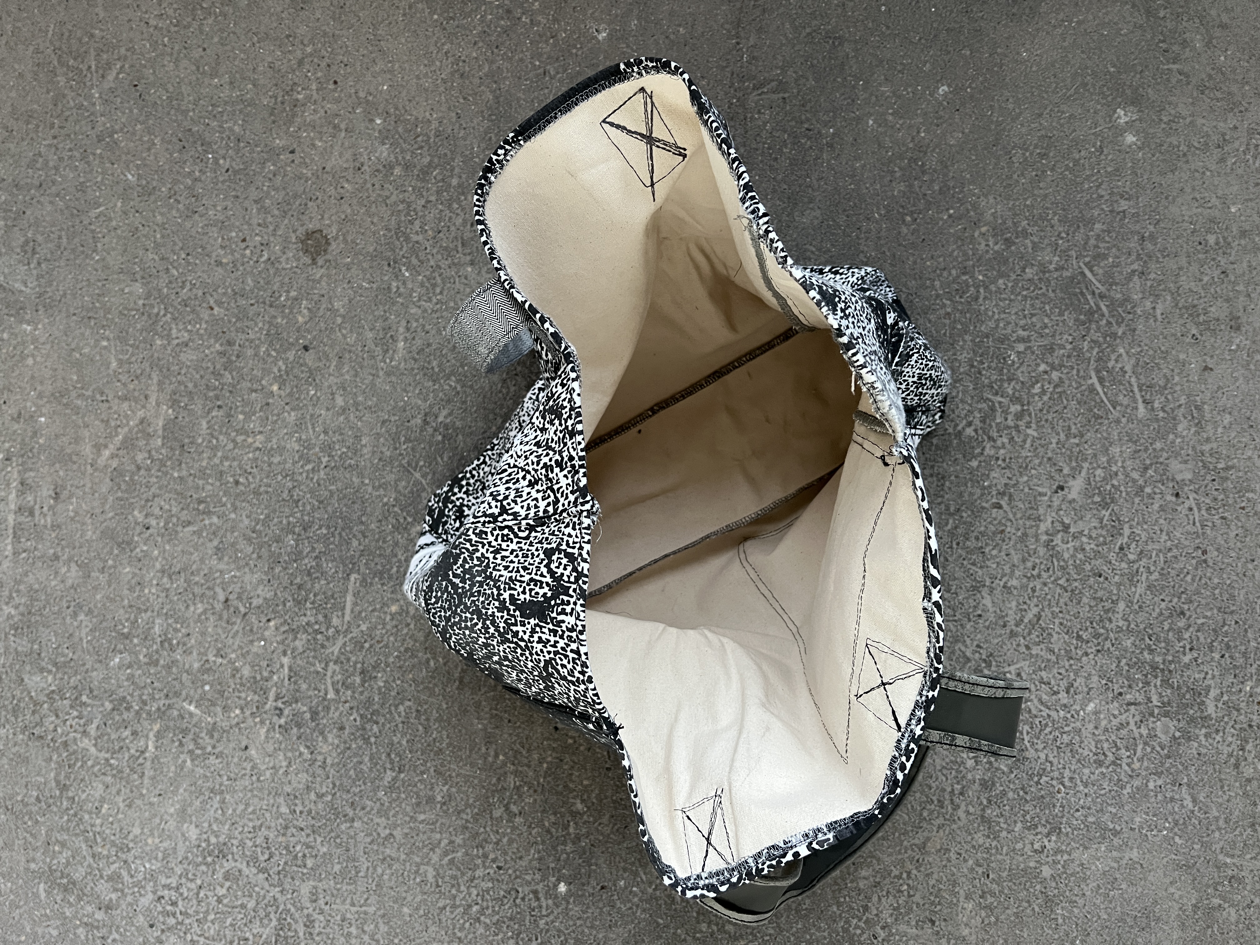 Five Panel Canvas box bag constructed from one reconfigured pair of allover printed static screenprint. Black textile ink on white canvas. Functional pants pocket on front panel. Reinforced seams with black cotton topstitching throughout.