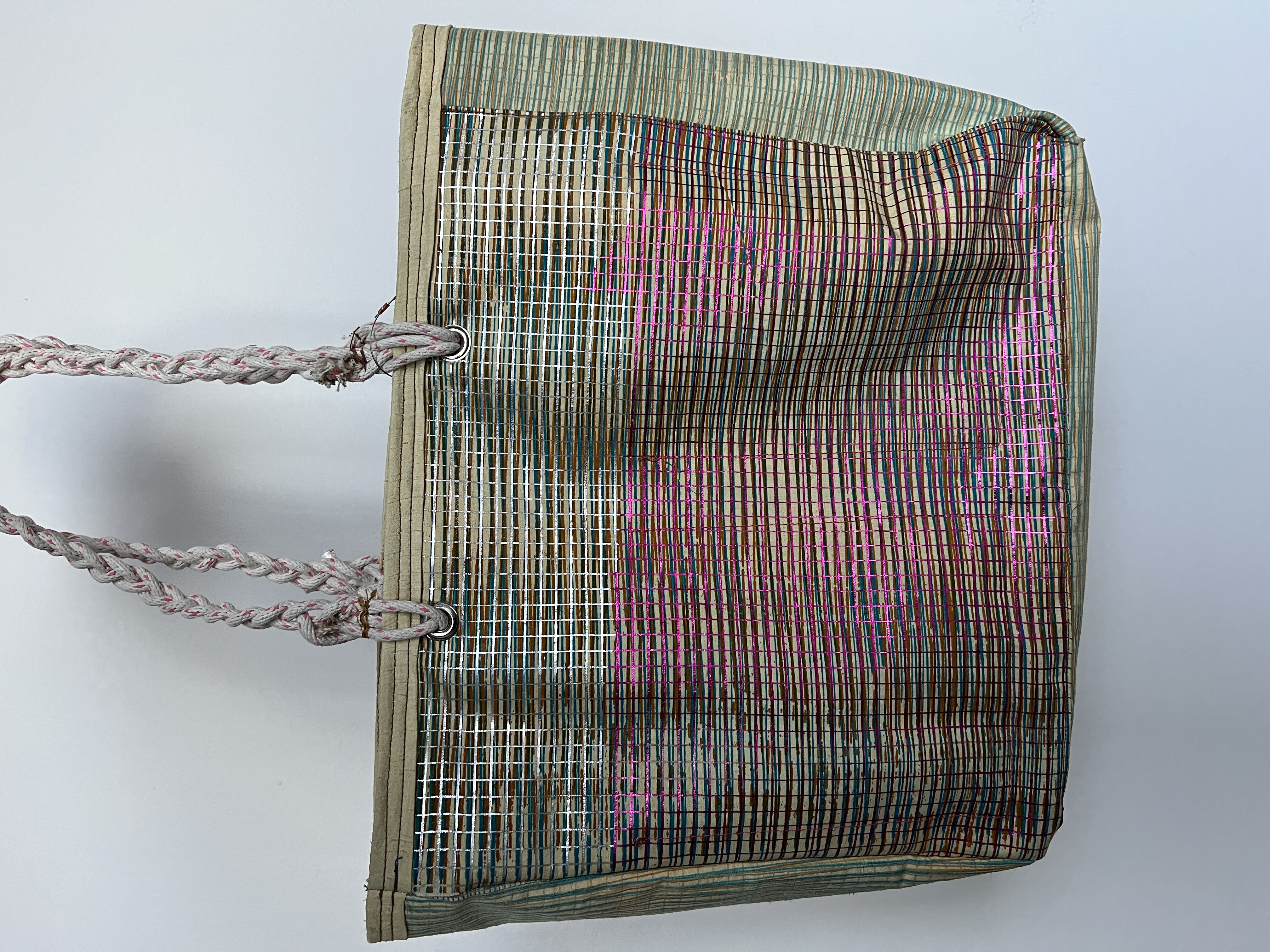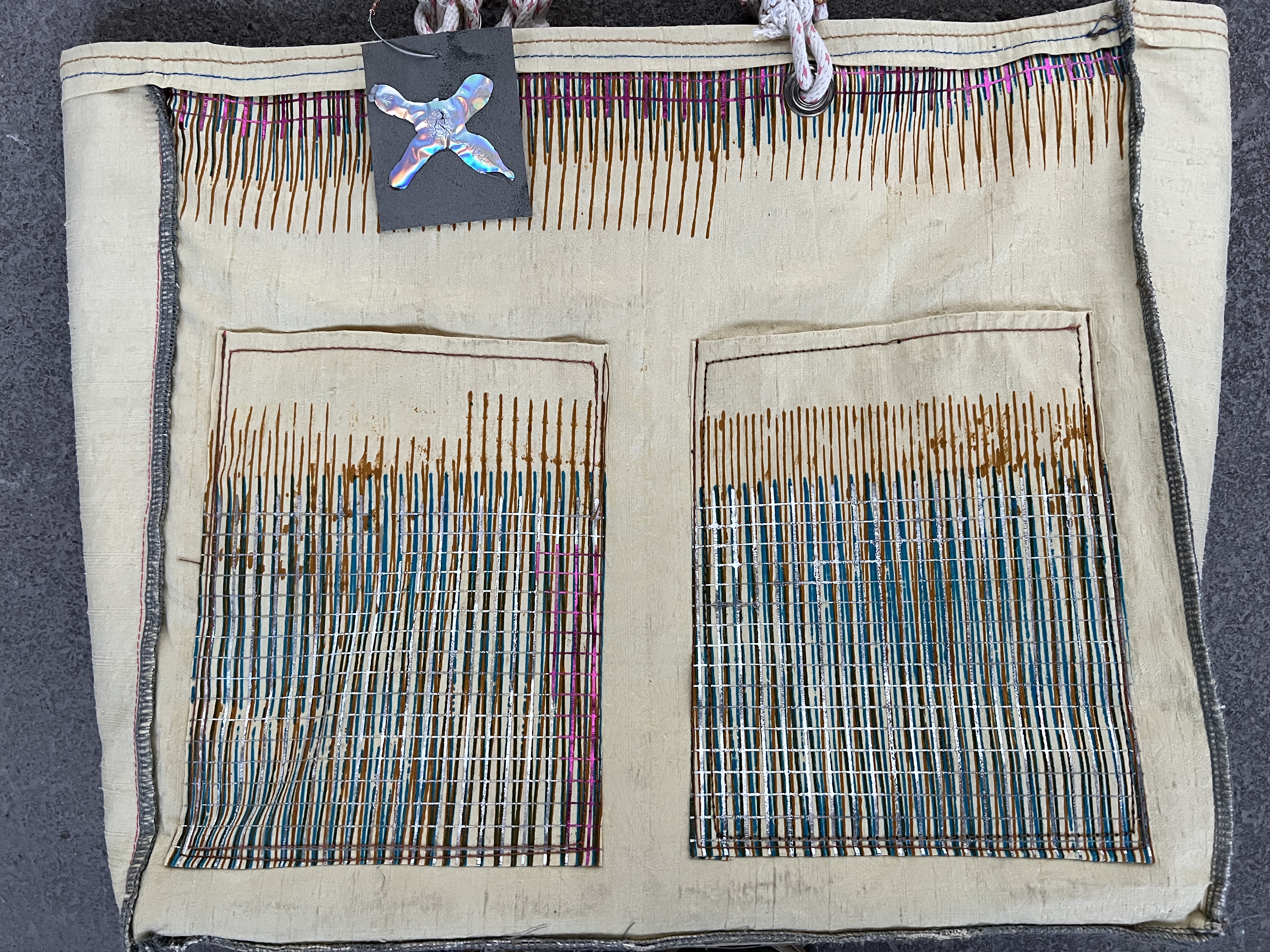 Side 1: Archival Foil Printed Moiré lightweight hand dyed linen fabric by Christine. Side panels made from the same fabric but reversed. Backside constructed from crinkle printed fabric by Nick. Hand dyed heavyweight canvas allover printed with textile dye. Dye print allows fabric to retain softness while preventing fading.