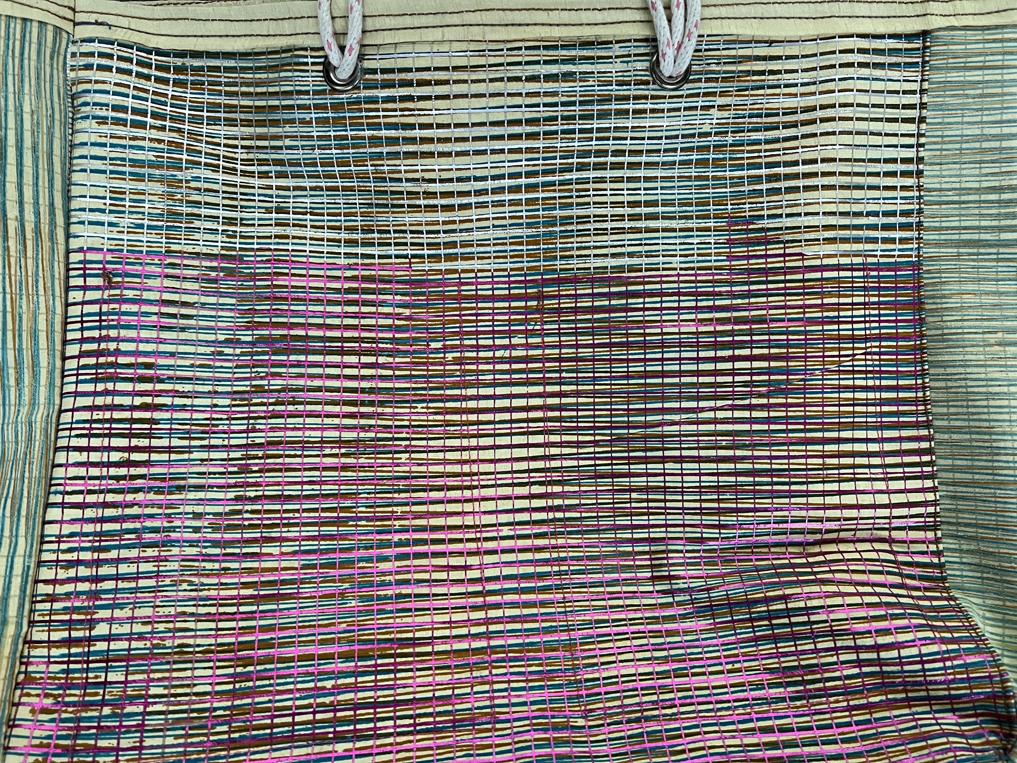 Straps made from industrial grade pink and white roping hand braided and loops adhered. Silver grommets holding straps.