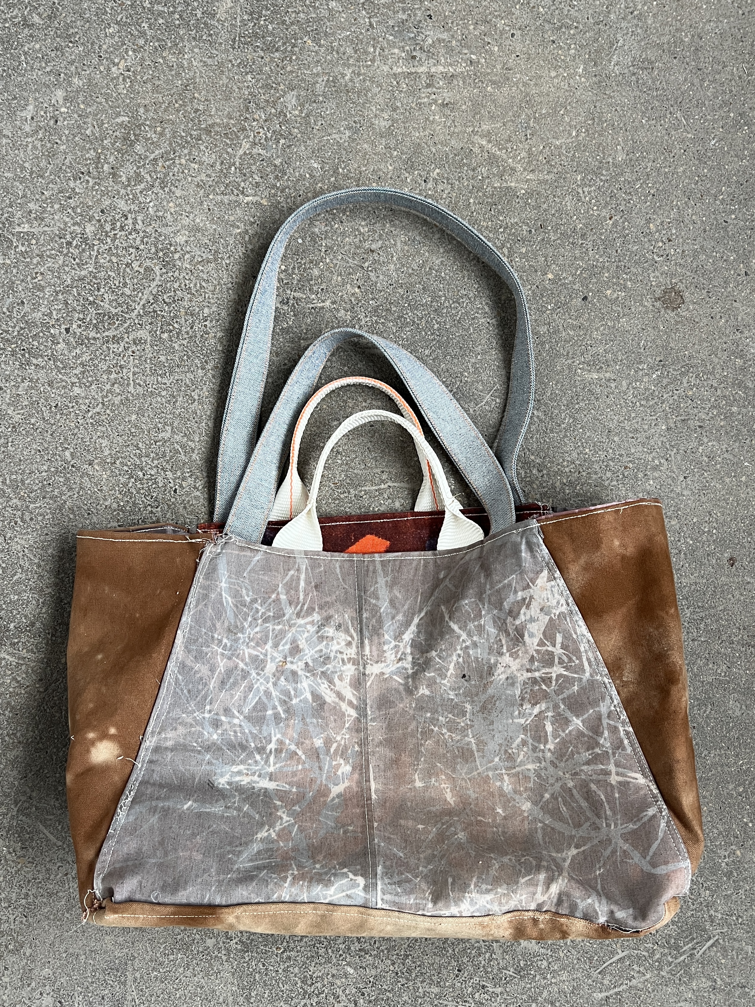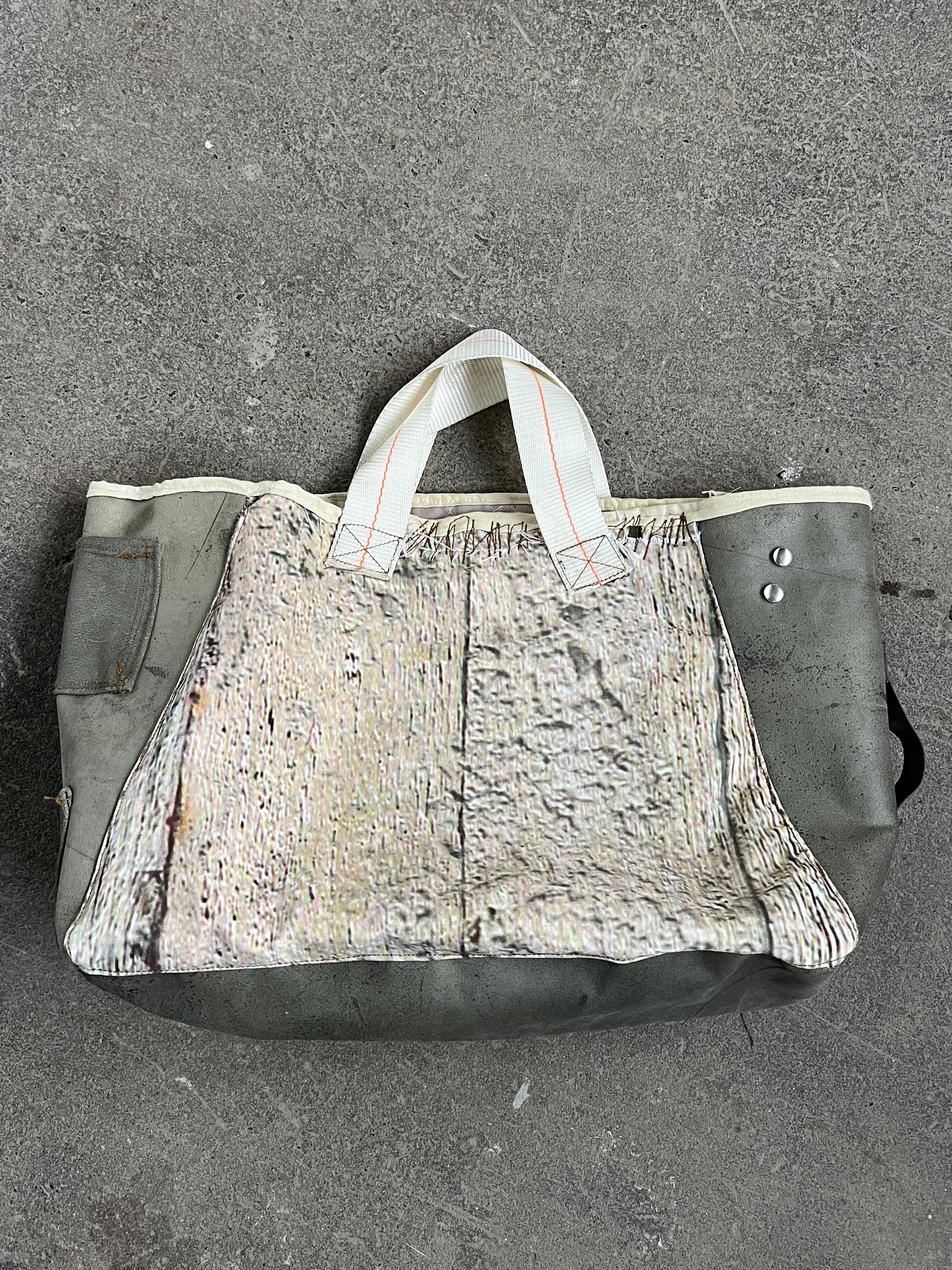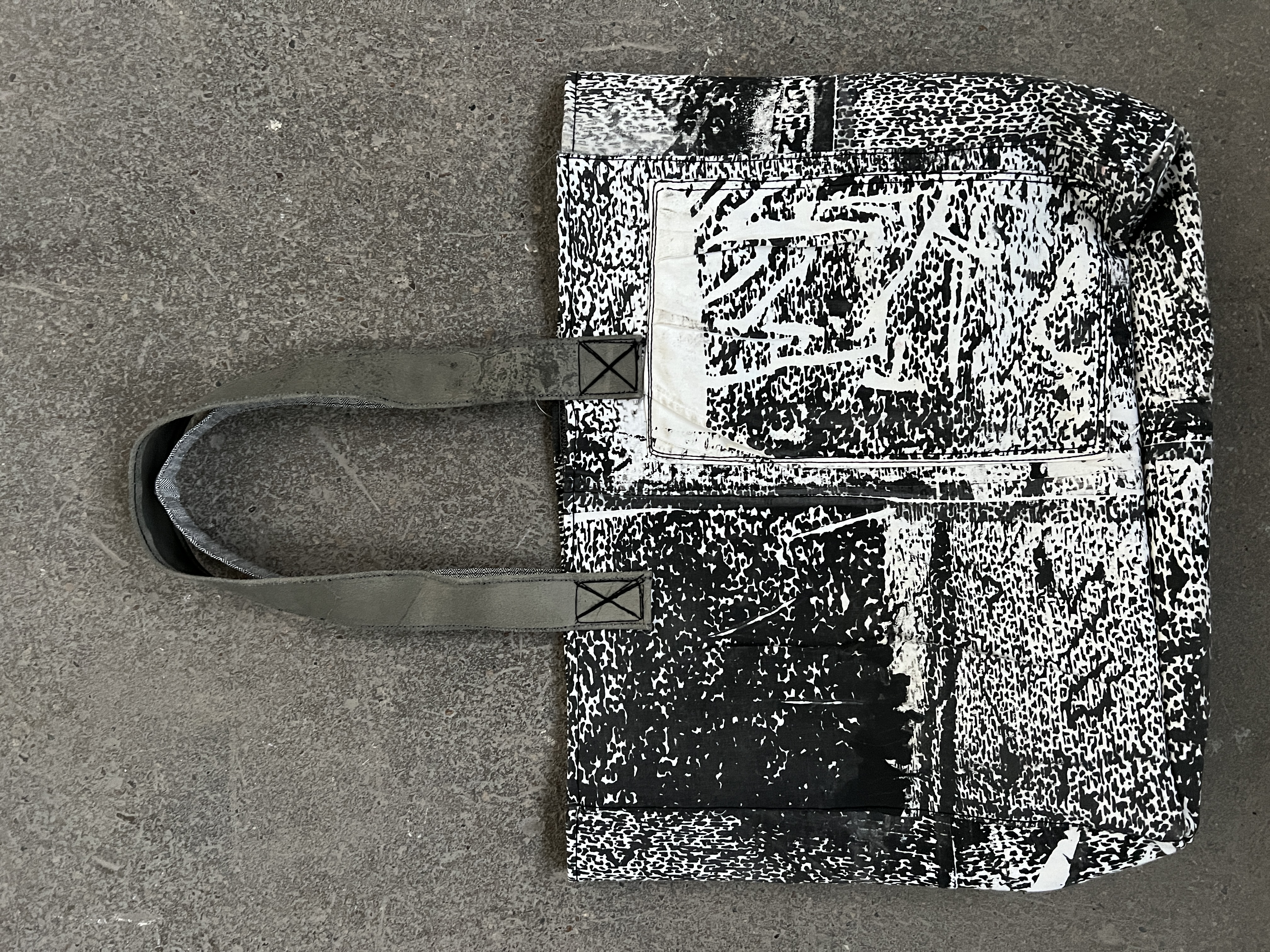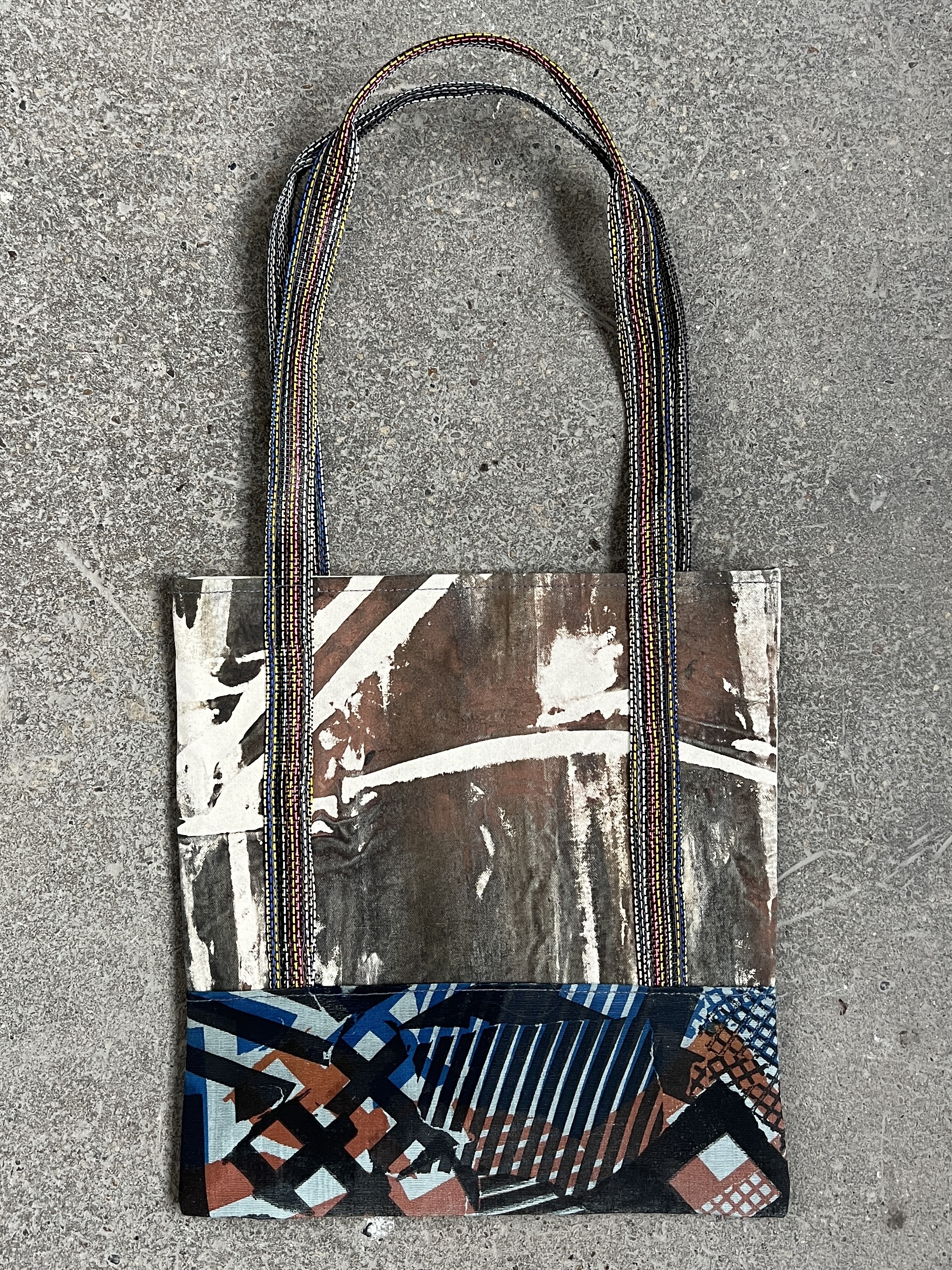 Every bag uses exceptionally fashioned hand printed or hand architected cloth or substrates for the artistic purpose of each bag. The pliable surfaces are manipulated using a variety of techniques using printmedia expertise and dye processes.