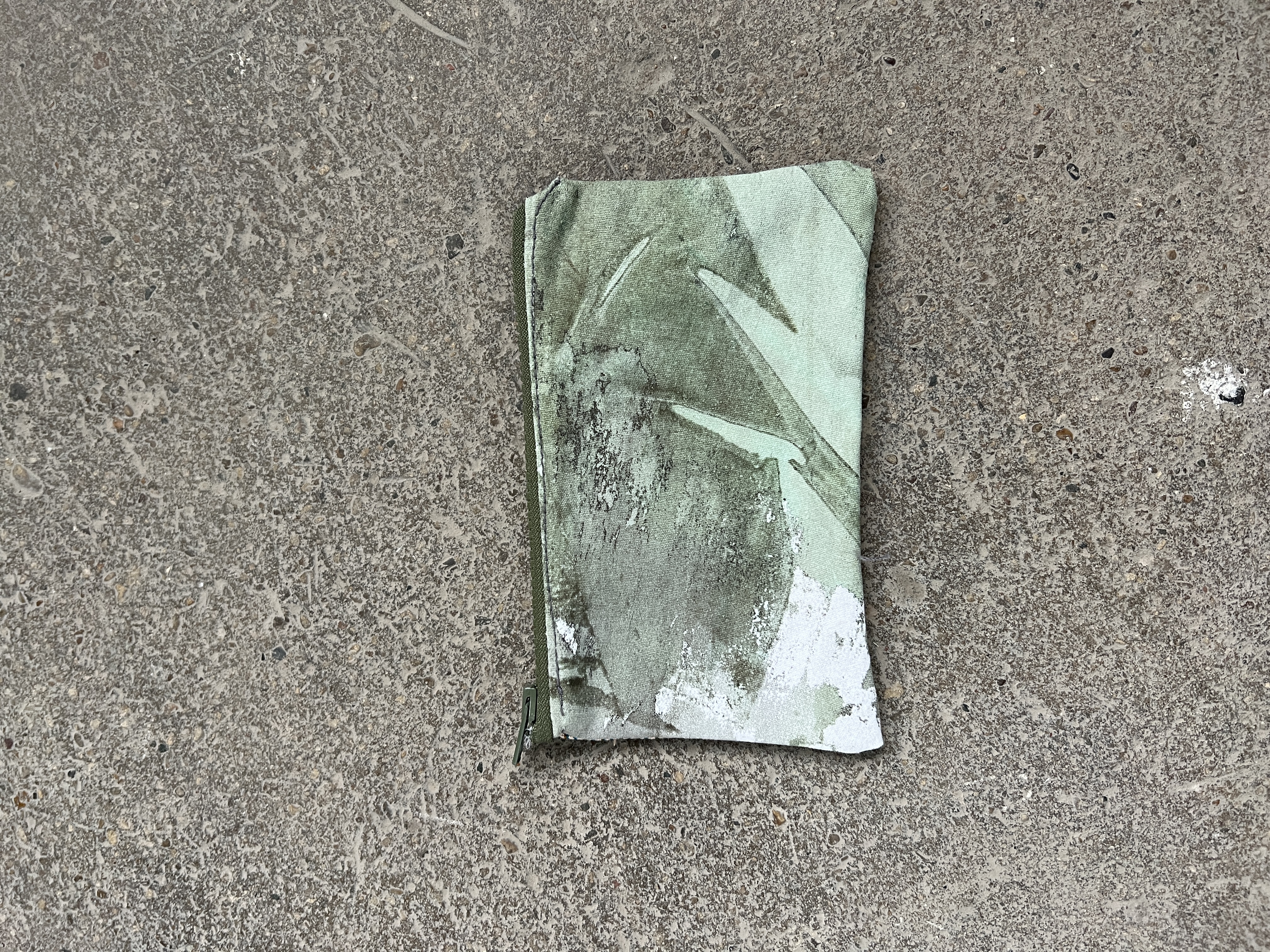 Pencil case constructed from archival four color screen printed linen fabric made by Christine Tarkowski. Reverse made from metal printed heavyweight cotton printed by Nick. Army green zip closure.