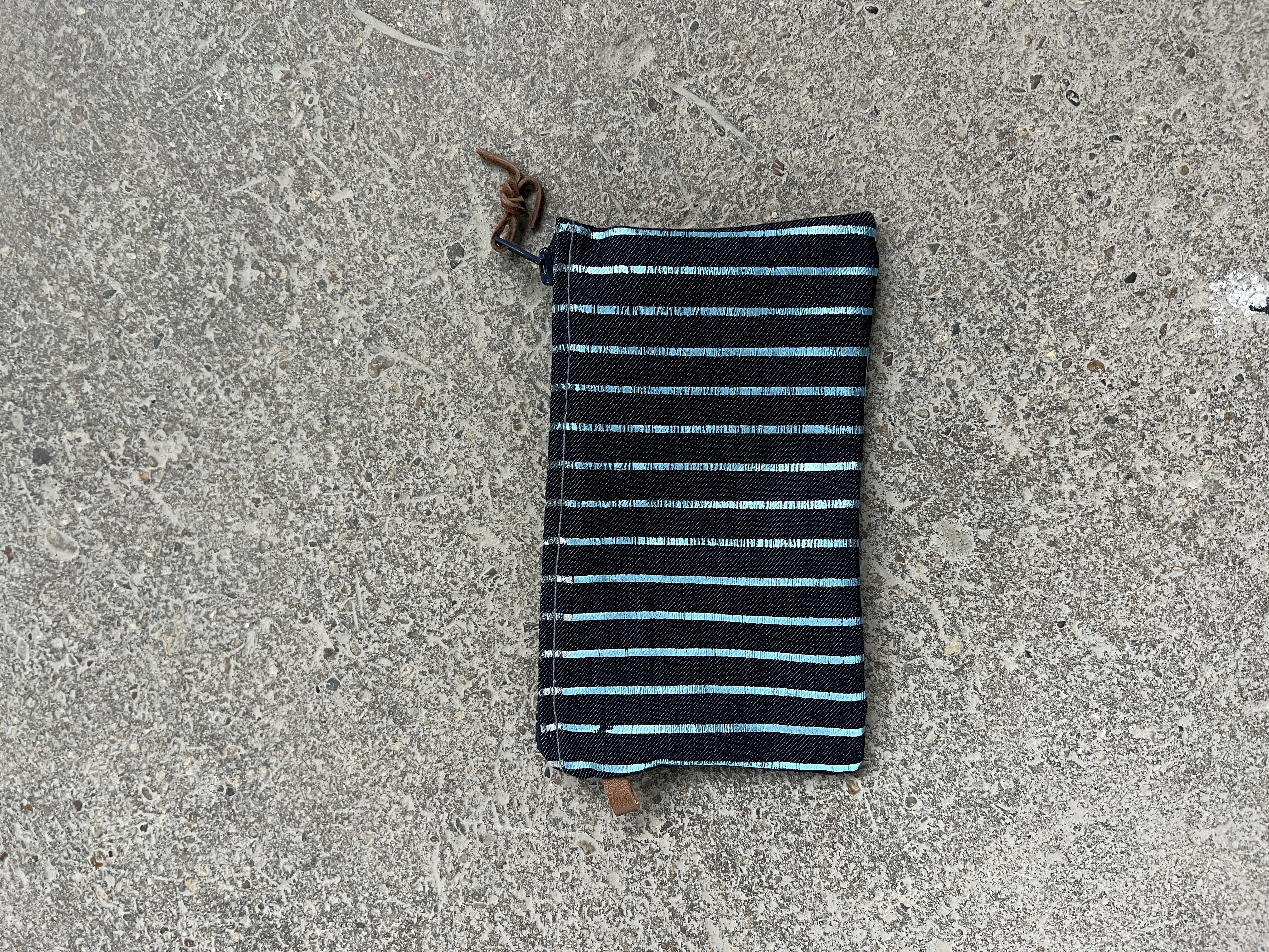 Pencil case constructed from archival heavyweight blue canvas screenprinted and foiled by Christine. Reverse side printed using iron, copper, and aluminum and patinated to give fabric variable hues. Leather pull tab. Dark blue zip closure.